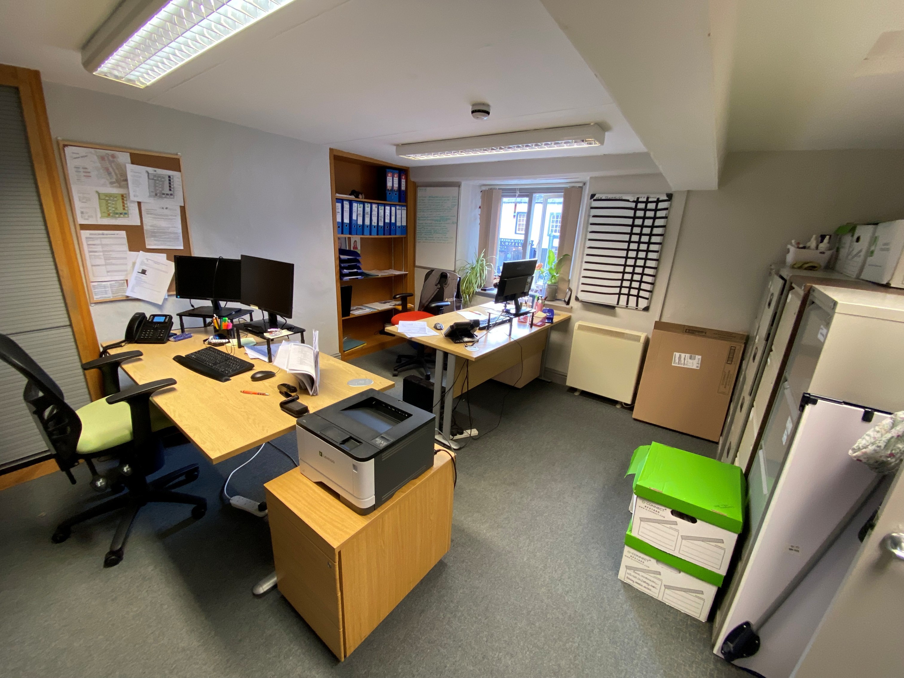 Upon entry, the ground-floor sales area is open-plan, with stepped access to a rear office and a side door to the enclosed yard. Stairs to the left of the unit lead to the first floor, with part being a flying freehold.